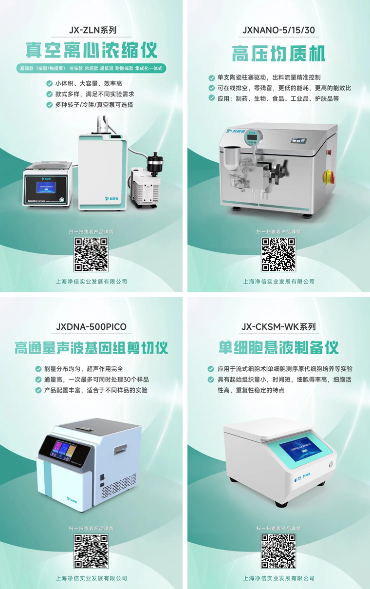 十幾年來凈信不斷進行自我創(chuàng)新與突破。通過持續(xù)優(yōu)化產(chǎn)品性能和提升服務質(zhì)量,我們實現(xiàn)了從單一產(chǎn)品到多元化發(fā)展的轉變,拓展了市場影響力。上海凈信科研者系列產(chǎn)品也在上市推廣中!真空離心濃縮儀、高壓均質(zhì)機、單細胞懸液儀、高通量聲波基因組剪切儀。